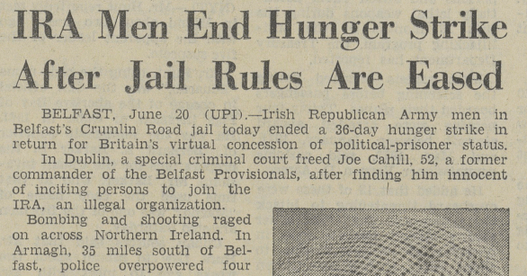 BELFAST, 20 Haziran’daki Crumlin Yolu’ndaki Crumlin Yolu’ndaki Cumhuriyet Ordusu askerleri, İngiltere’nin siyasi kararından fiilen taviz teslimi yarın 36 açlık grevine son kararı verdi.
